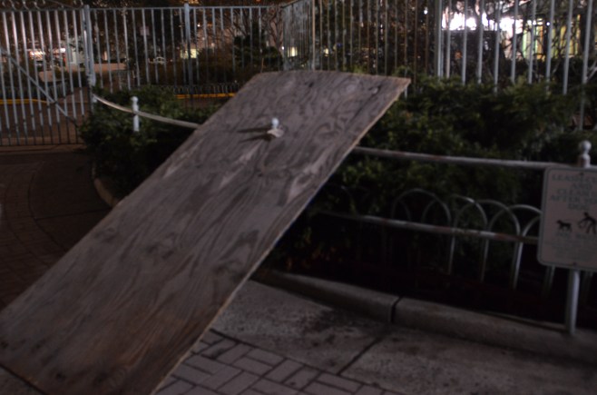 And debris… this board was from none of the nearby building. Impaled onto a blunt tipped railing! Wouldn’t have wanted to be in the path of that